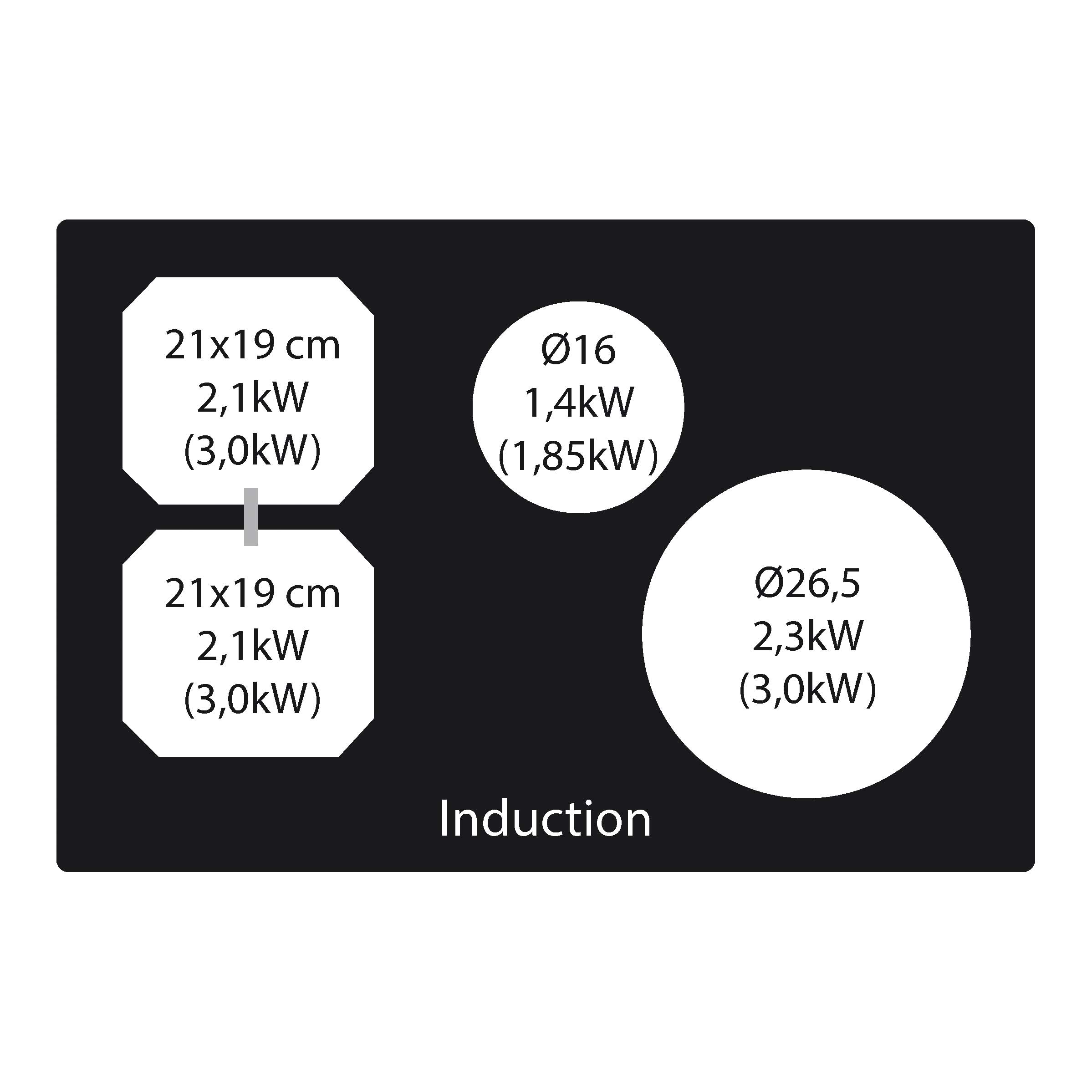 I venstre side kan forreste zone og bagerste zone kobles sammen til én kogezone på 21x38 cm