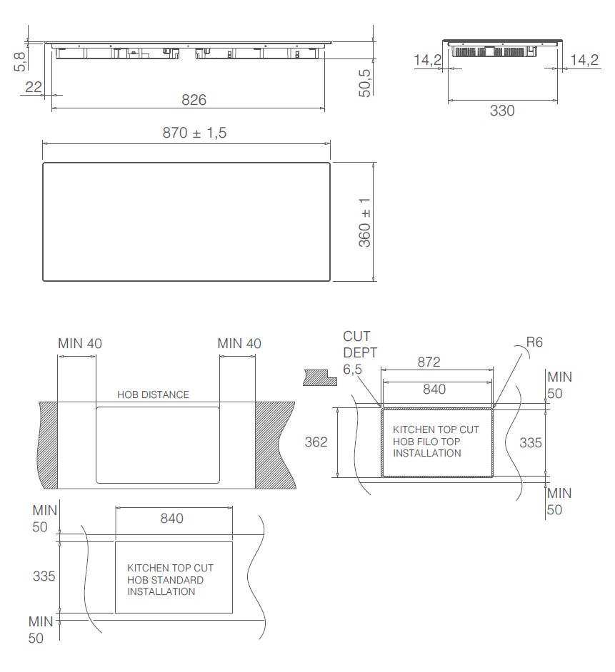 - Indbygning (BxDxH): 840 x 335 x 56,3 mm
