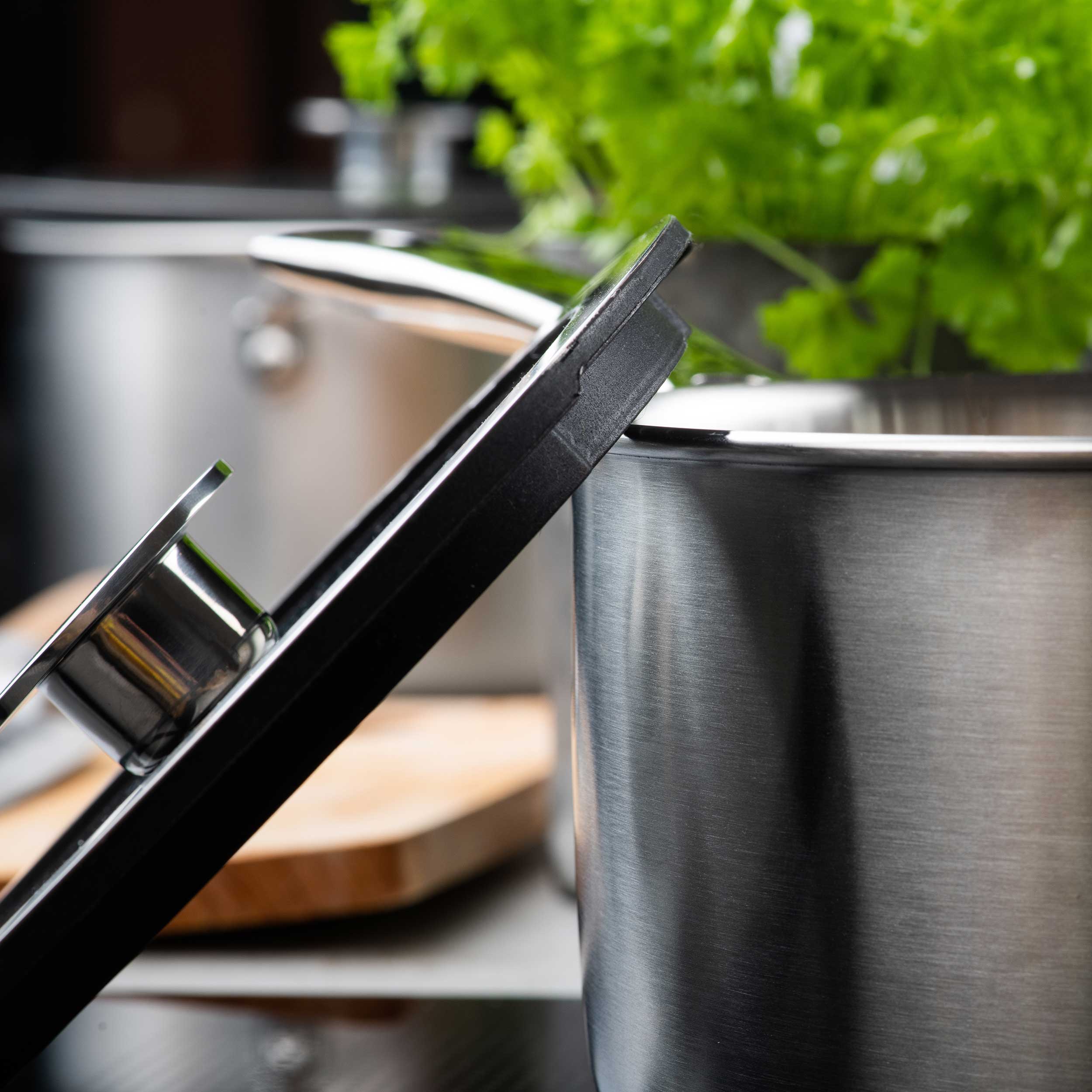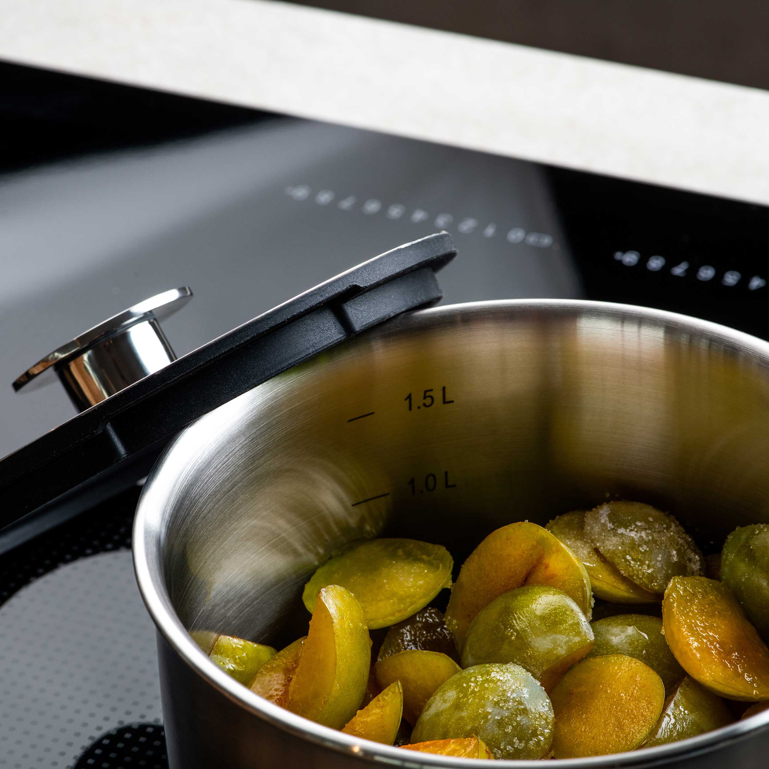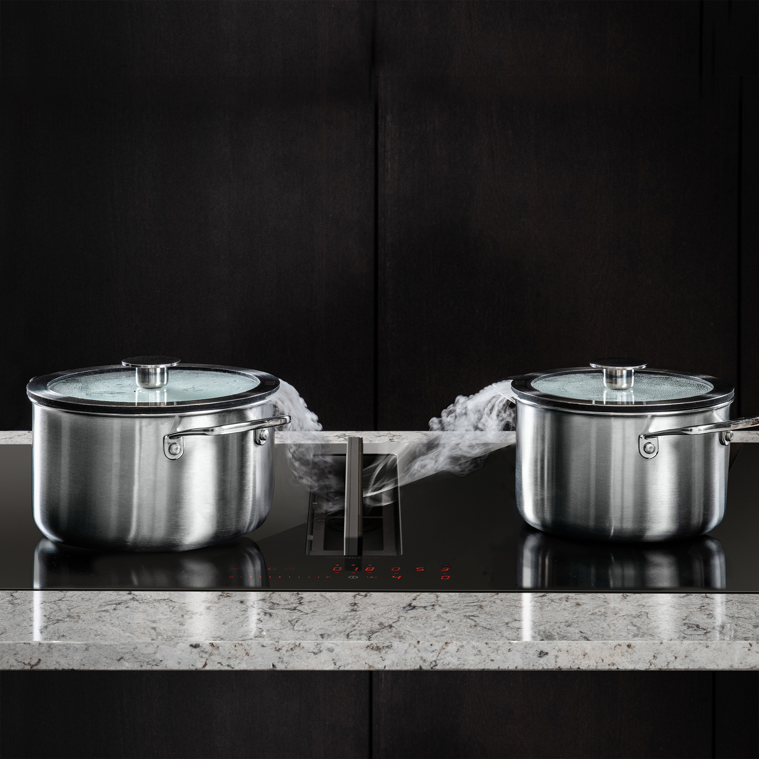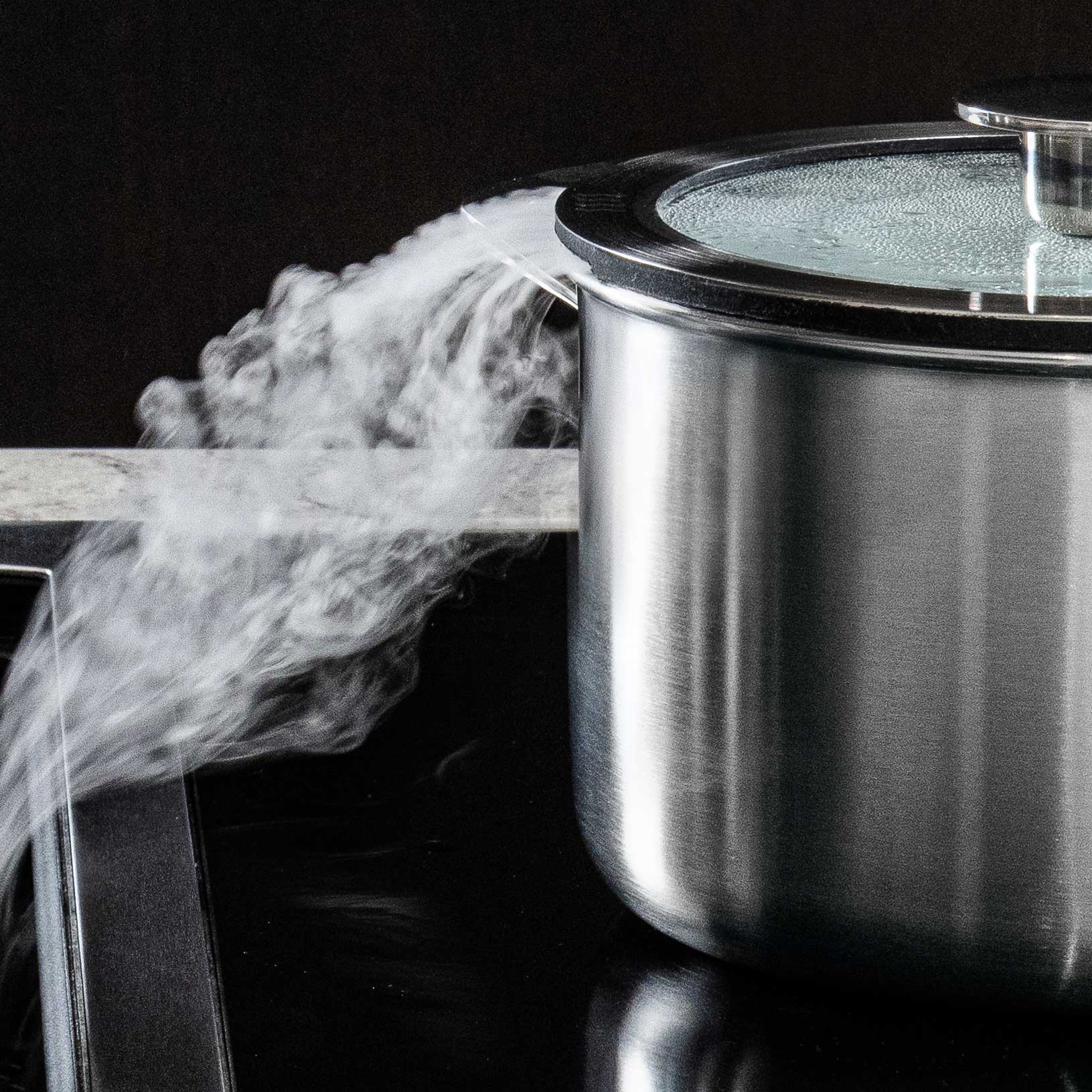 7-dele i sæt. Der er dampudslip i glaslåget. Herved kan dampen ledes sidelæns for optimal funktion sammen med aspiration hobs.
