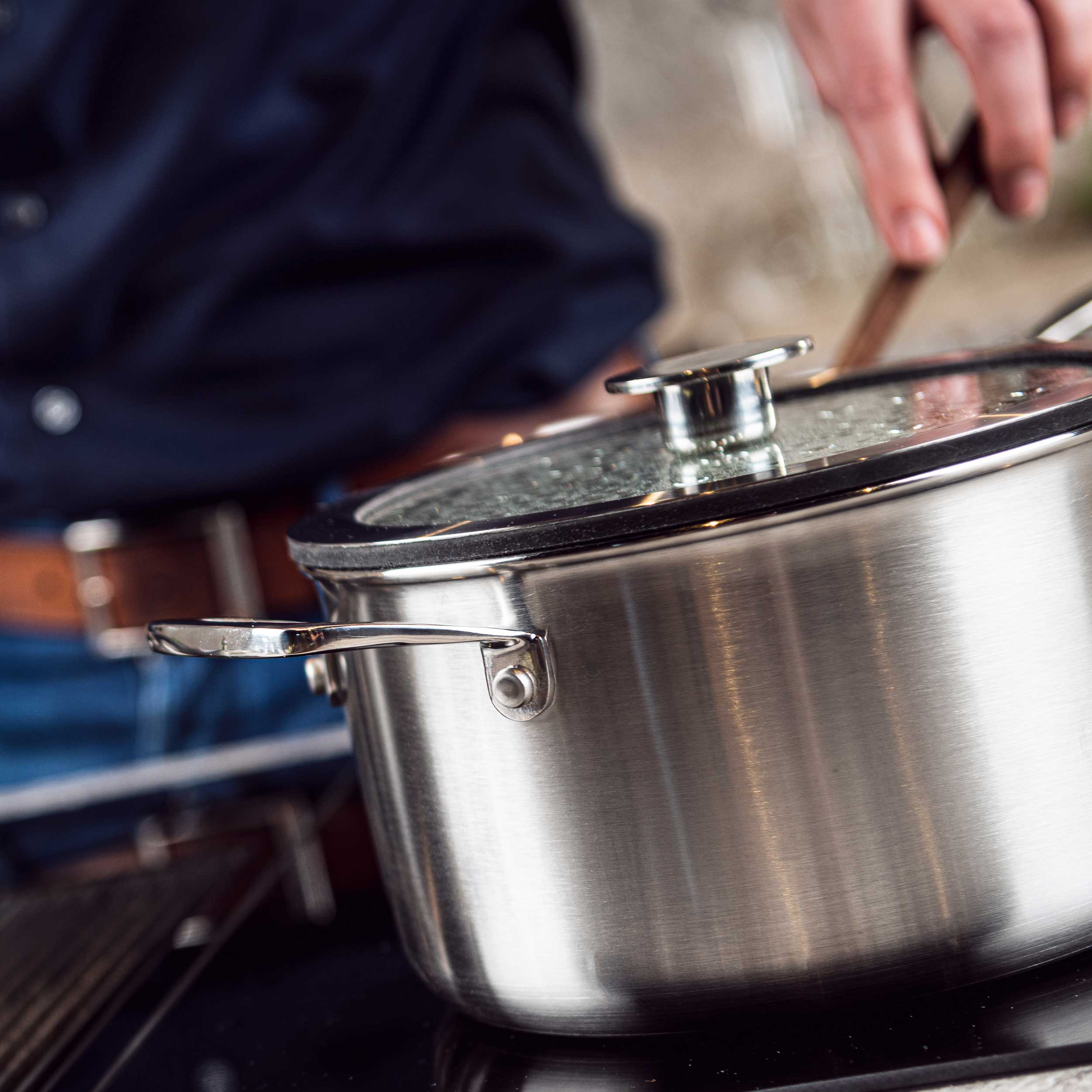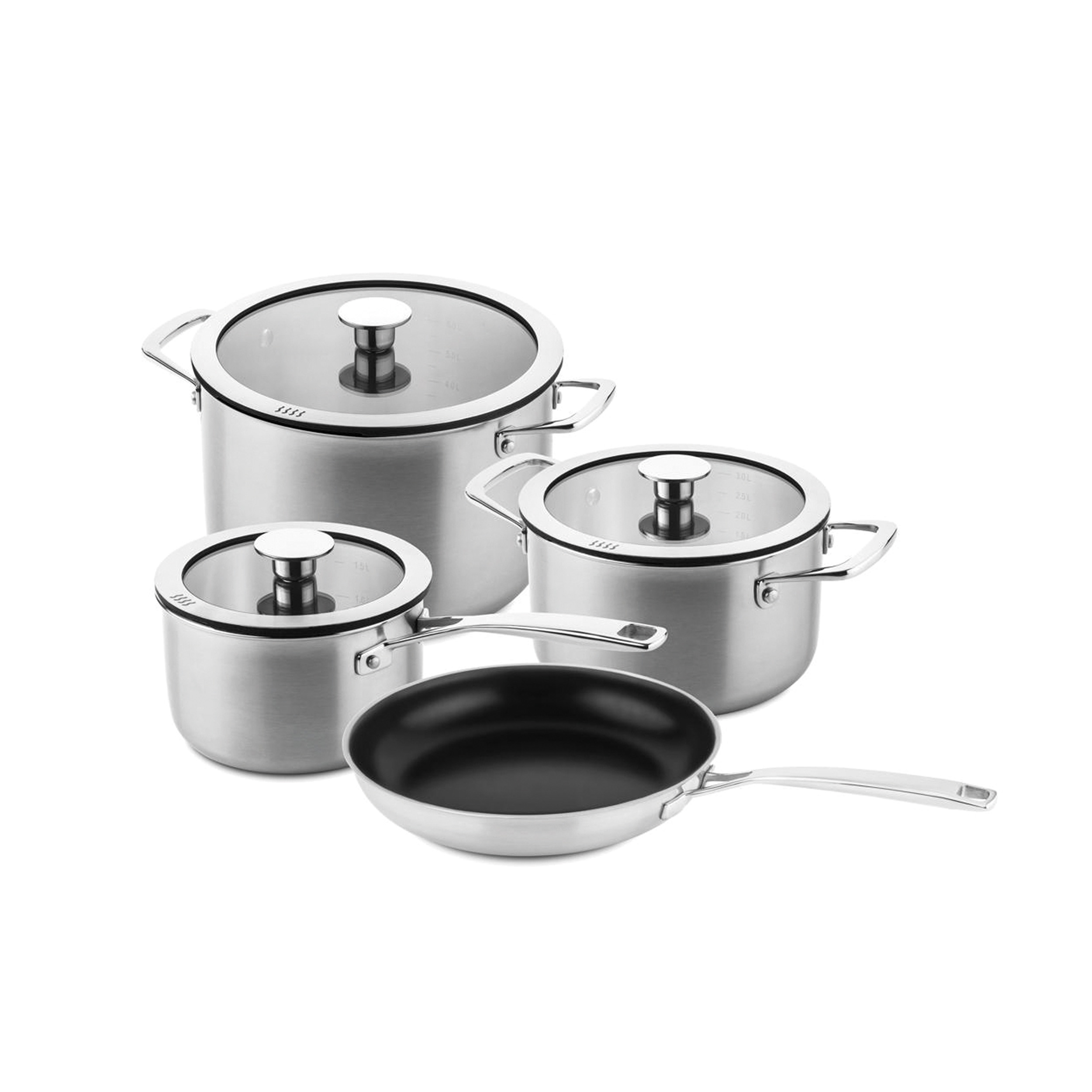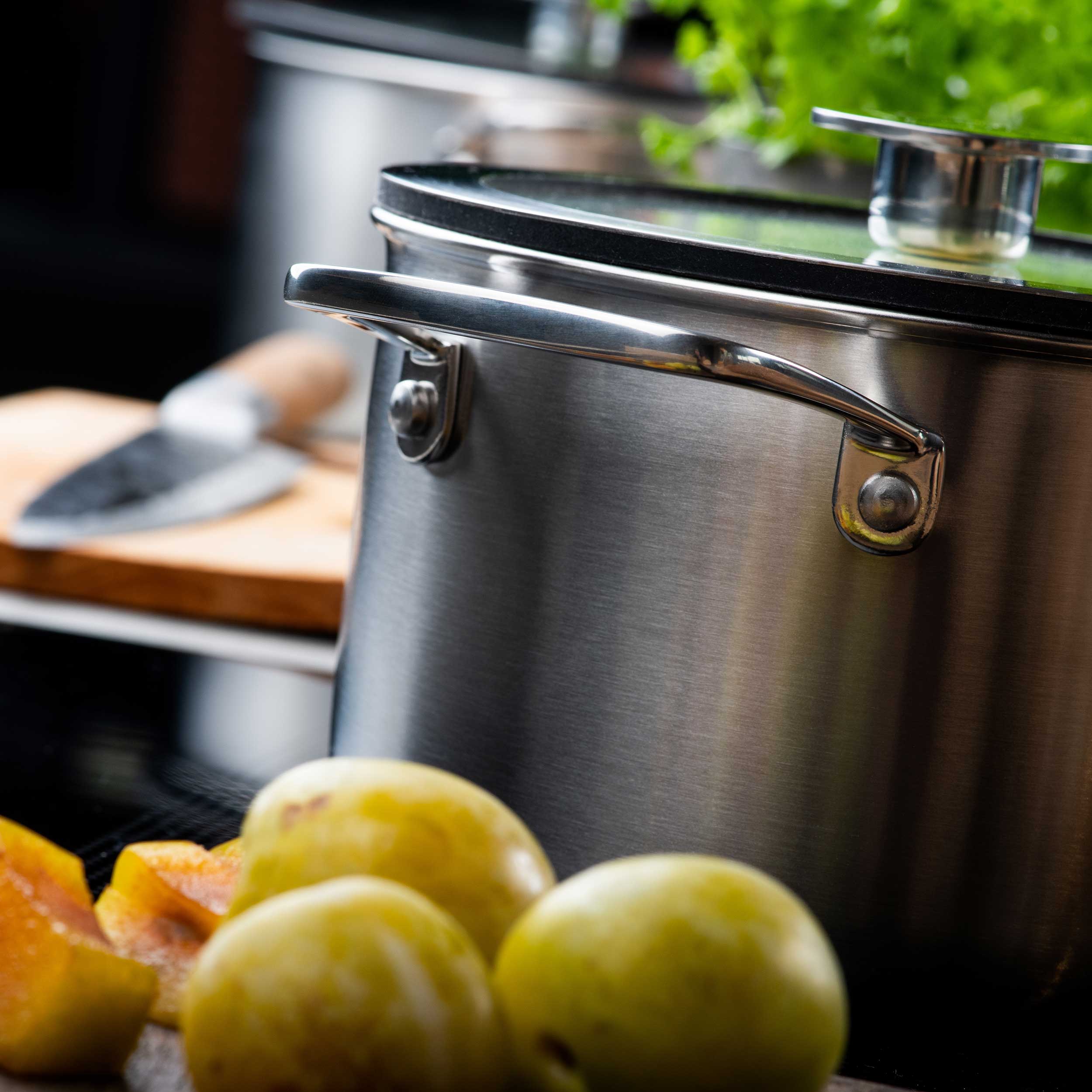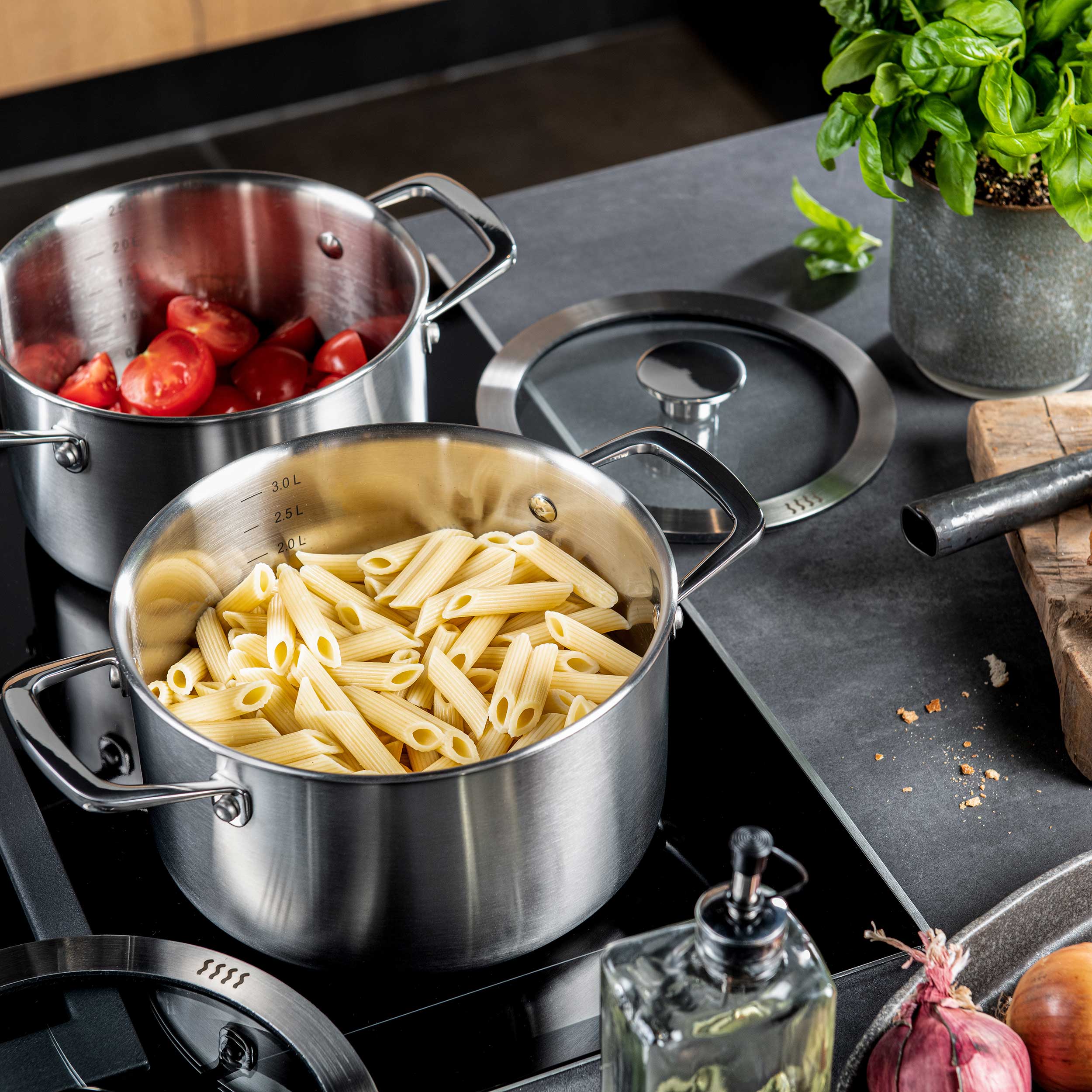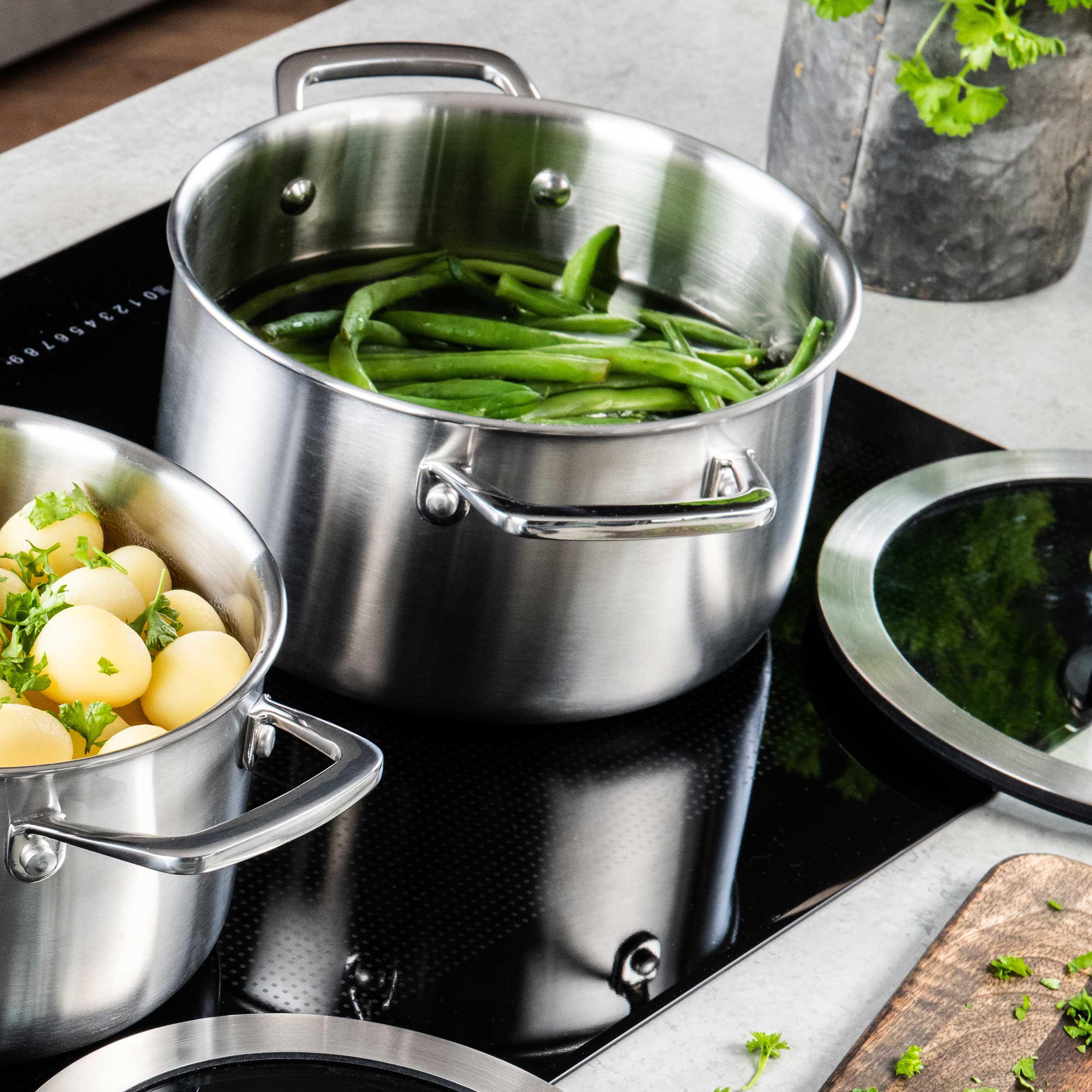 7-dele i sæt. Der er dampudslip i glaslåget. Herved kan dampen ledes sidelæns for optimal funktion sammen med aspiration hobs.