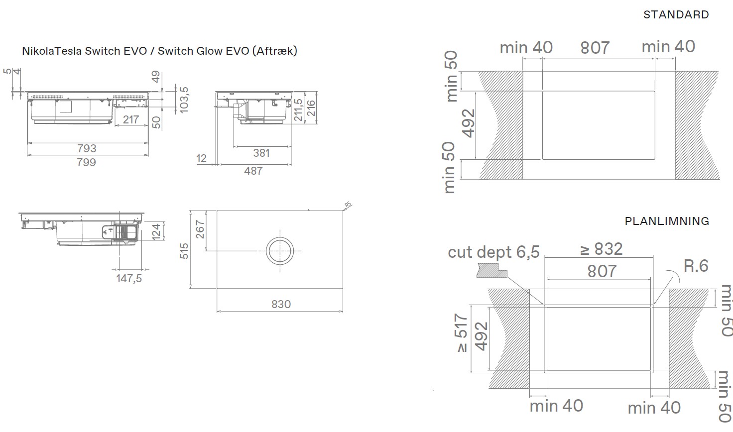 - Luftstrøm min-max 130 - 525 m3/t
